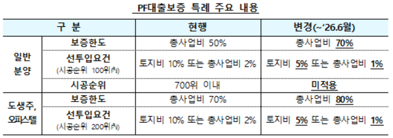 이번 개선안에 따라 내년 6월까지 PF 대출 보증 한도는 총사업비의 50%에서 70%로 확대된다. 동시에 그동안 보증 요건으로 적용되던 시공사 시공순위 ‘700위 이내’ 제한은 폐지돼 중소 건설사의 참여도 확대된다. 이 같은 요건 완화 특례는 오는 2026년 6월까지 1년간 한시적으로 적용된다.