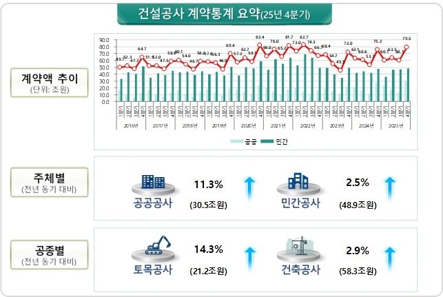 국토교통부는 2025년 4분기 건설공사 계약액이 전년 같은 기간보다 5.7% 증가한 79조5000억 원으로 집계됐다고 26일 밝혔다.