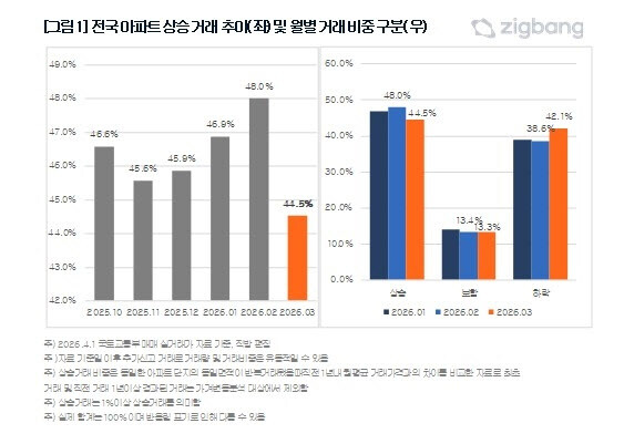 반면 비수도권의 상승거래 비중은 44.9%로 전월 대비 0.7%포인트 낮아지는 데 그쳐, 수도권에 비해 상대적으로 안정적인 흐름을 유지했다.