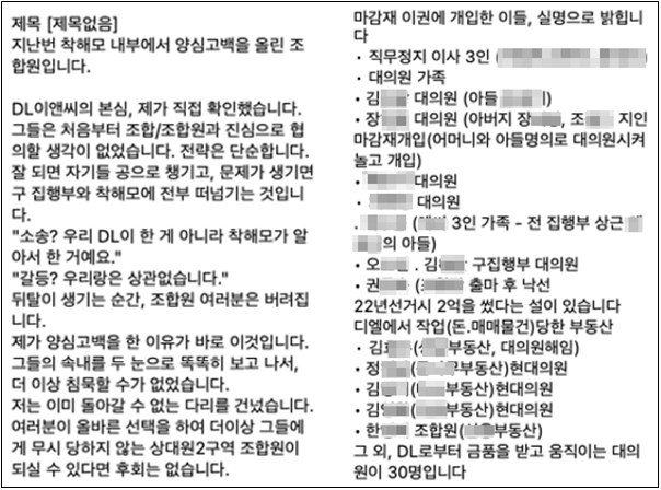 A씨는 "이 외에도 DL이앤씨로부터 금품을 받고 움직이는 대의원이 30명"이라며 "다시 저에게 '신고하겠다', '허위 사실이다'고 말하는 순간 돈을 받은 대의원 30인의 명단을 전명 공개하겠다"고 말했다.