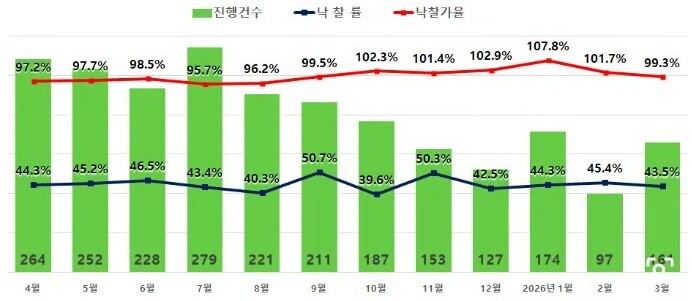 1일 경·공매 데이터 전문기업 지지옥션에 따르면, 3월 서울 아파트 경매 낙찰가율은 전월(101.7%) 대비 2.4%p 하락한 99.3%를 기록했다. 지난해 10월 이후 5개월 연속 이어지던 100%대 고공행진이 멈춘 것이다.
