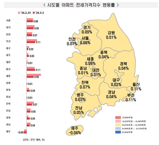 지방 전세는 부산·울산이 각각 0.11%로 상승폭이 컸다. 부산 수영구(+0.22%)는 남천·민락동 위주로, 울산 남구(+0.18%)는 옥·무거동 위주로 올랐다. 세종은 0.09% 상승했다. 제주(-0.04%)는 매매와 전세 모두 내렸다.