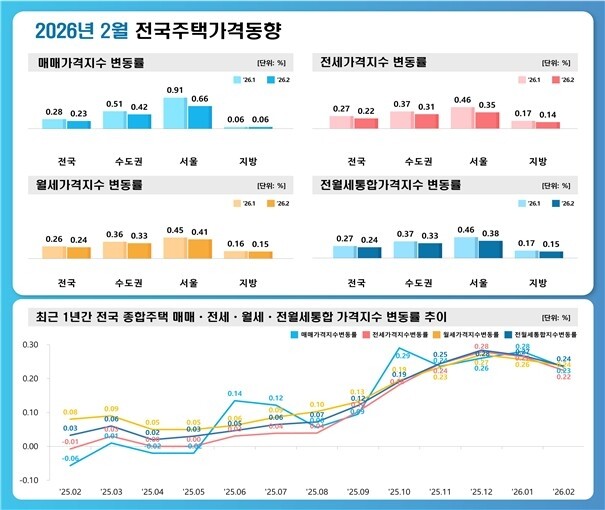 한국부동산원이 16일 발표한 '2월 전국 주택가격 동향조사'에 따르면, 서울 주택종합 매매가격 상승률은 0.66%를 기록하며 전월(0.91%) 대비 0.25%포인트 축소됐다.