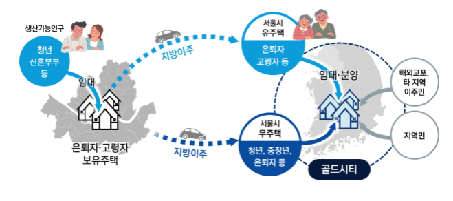 골드시티는 인생 2막을 여유롭게 즐기고 싶은 서울시민을 위해 청정 자연과 도시 인프라를 갖춘 지방 도시에 고품질 백년주택과 관광, 휴양, 요양, 의료, 교육시설을 조성해 이주 지원하는 서울 지방 상생형 순환주택사업이다.