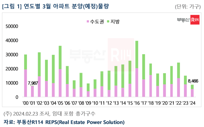 봄이 시작되는 3월은 분양시장에서 성수기로 통하지만, 올해는 다른 양상을 보일 전망이다. 청약제도 개선으로 청약홈이 개편되면서 3주(3/4~3/22) 동안 분양시장이 쉼에 들어가기 때문이다. 부동산R114(www.r114.com)에 따르면, 2024년 3월 전국 아파트 분양계획 물량은 동월 기준 2001년(7,987가구) 이후 가장 적은 8,466가구로 집계됐다. 권역별로 수도권 5,582가구, 지방 2,884가구가 공급될 예정이라 전반적으로 조용한 분위기가 예상된다.