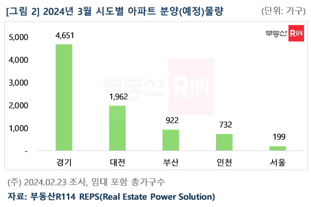 시도별 3월 분양예정 물량은 △경기(4,651가구) △대전(1,962가구) △부산(922가구) △인천(732가구) △서울(199가구) 순이며, 그 외 지역에서는 물량이 전무하다. 3월 예정된 1,000가구 이상 대단지 3곳 중 ‘북수원이목지구디에트르더리체Ⅰ(1,744가구)’, ‘지제역반도체밸리해링턴플레이스(1,209가구)’ 등 2곳이 경기 물량이다. 서울은 '경희궁유보라(199가구)'가 예정돼 있다.