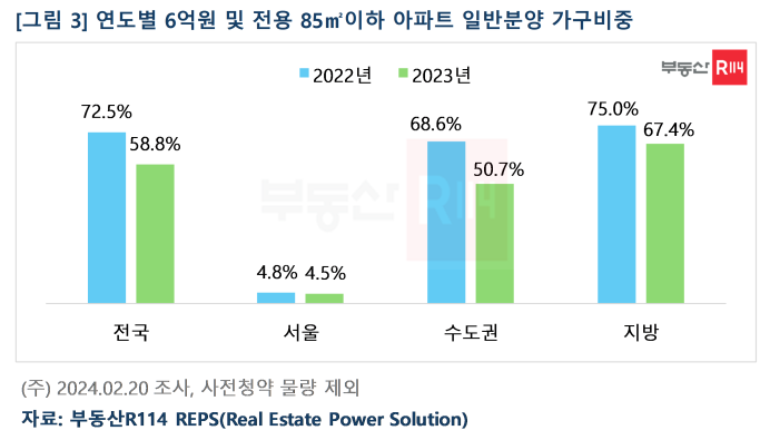 부동산R114가 최근 2년 전국 아파트 일반분양(사전청약 제외) 물량 가운데, 6억원, 전용 85㎡이하 가구비중을 살펴본 결과, 2022년 72.5%(22만487가구 중 15만9,801가구)에서 2023년 58.8%(13만4,387가구 중 7만9,084가구)로 13.7%P 줄었다. 원자잿값, 인건비 등 상승과 고분양가 규제완화 등으로 분양가가 오른 영향이 크다. 특히 서울은 청년주택드림대출 대상이 되는 아파트 가구비중이 4%대에 불과해, 서울보다는 수도권, 지방에서 통장 활용도가 높을 것으로 예상된다.