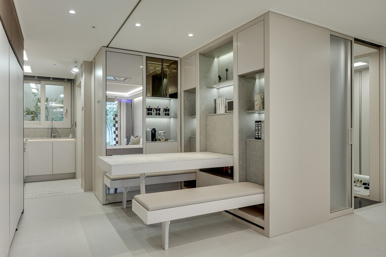 최근 업그레이드된 현대건설 ‘2023 트랜스포밍 월 & 퍼니처’도 우수디자인상품으로 선정됐다. 주방에서 전동식 가구 벽체를 버튼 하나로 움직이며 벽면에 매입된 식탁, 벤치, 테이블 등의 가구를 활용하여 정해진 공간을 가변적으로 만들어 실내공간의 사용성을 극대화했다.