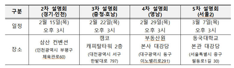 한국부동산원은 이번 설명회를 시작으로 3월 7일까지 매주 권역별(경기‧인천, 충청‧호남, 영남, 서울) 현장설명회를 실시할 예정이며, 2차 설명회는 2월 15일 경기·인천지역 대상으로 진행한다.