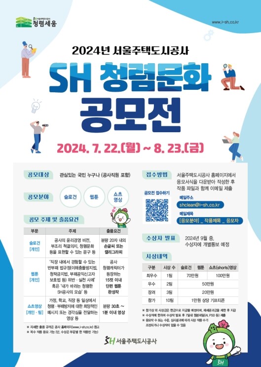 [한국건설경제뉴스=이보미 기자] 서울주택도시공사(SH공사)는 22일부터 다음달 23일까지 '2024년 SH 청렴문화 공모전' 작품 접수를 받는다고 밝혔다.