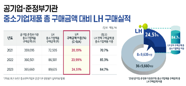 LH는 최근 3년간 총 24조원 규모로 중소기업제품을 구매했고, 전체 구매 실적(30조원) 가운데 중소기업 제품 비중이 80%에 달했다고 설명했다.