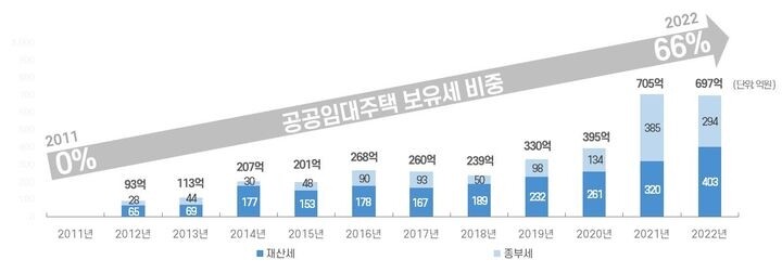 2023년부터는 공공주택사업자의 경우 2주택 이하 소유자와 동일한 최대 1,000분의 27의 종부세율을 적용받고 있으나, 여전히 과중할 뿐만 아니라 불필요한 규제라는 게 SH공사 측의 설명이다. SH공사가 2023년 기준 납부한 종부세는 약 148억원으로, 그중 주택 종부세는 약 83억원이다.