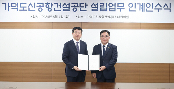 | ▲백원국 국토교통부 제2차관(오른쪽)과 이윤상 가덕도신공항건설공단 이사장이 업무 인계·인수를 마친 뒤 기념 촬영을 하는 모습. 사진=국토부 제공 |