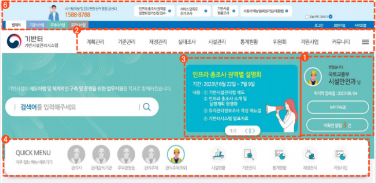 기반터는 인프라 총조사에서 집계된 중앙부처, 지자체, 공공기관, 민자사업자 등 약 1350개의 주체가 관리 중인 약 48만개의 시설물별 상세 정보를 통합 관리하고 자체 분석기능을 통해 시설물별 최적 관리를 돕는 스마트 시스템이다.