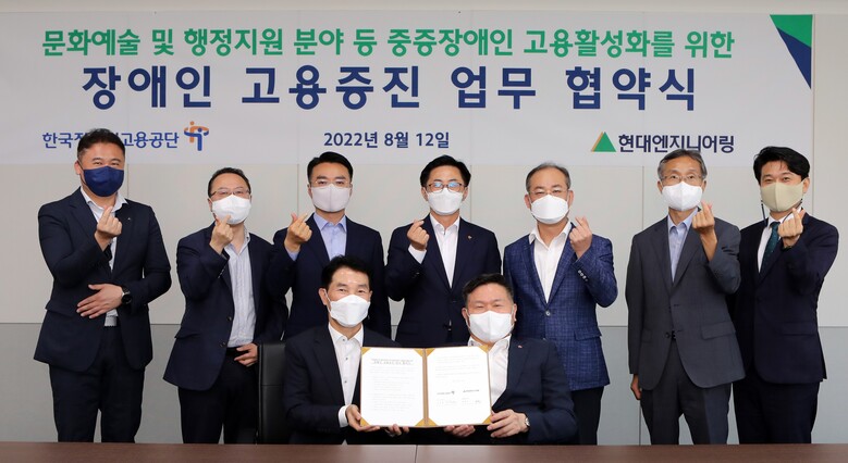 이날 체결식에는 현대엔지니어링 임승재 전략기획사업부장, 한국장애인고용공단 조향현 이사장 등 관계자들이 참석해 장애인 고용 확대를 위해 다양한 협력방안을 협의했다.
