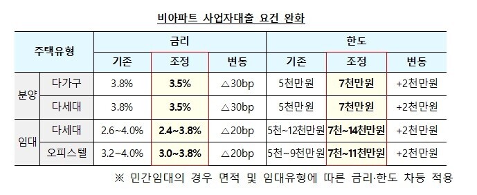 국토부는 2027년 말까지 비아파트 건설자금 대출에 대해 기존보다 금리를 20~30bp 인하하고 사업자당 한도금을 2000만 원 상향하기로 했다.