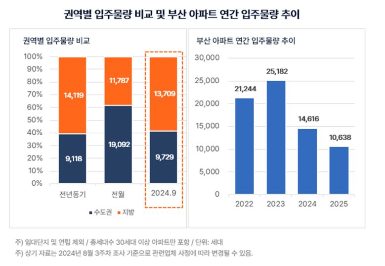 26일 직방에 따르면 9월 전국 아파트 입주 물량은 총 2만3438가구로, 이 중 절반을 넘는 1만3709가구가 지방 공급물량이다.