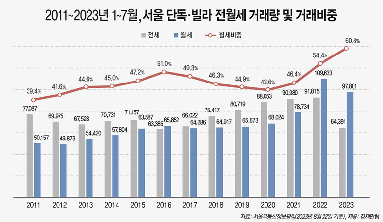 서울 비(非) 아파트 임대차 시장에서 월세가 차지하는 비중이 60%를 넘은 것은 서울부동산정보광장이 관련 통계를 집계하기 시작한 2011년(1~7월 기준) 이후 처음이다. 서울 비(非)아파트의 월세 비중은 2020년 43.6%, 2021년 46.4%, 2022년 54.4%로 상승세를 보이고 있다.