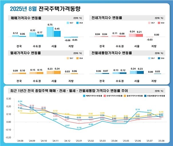 수도권 매매가격은 0.17% 올라 전월보다 상승폭이 축소됐다. 경기도는 0.05% 상승하며 성남 분당구·과천시·안양시 동안구 위주로 강세를 보였으나, 인천은 0.08% 하락했다. 비수도권은 -0.05%를 기록하며 하락폭이 소폭 확대됐다. 세종시는 0.15%로 오름폭이 커졌지만, 8개 도 지역은 하락세가 이어졌다.