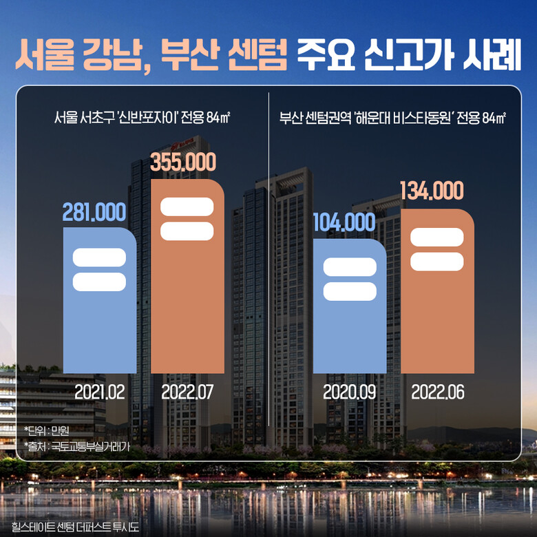 최근 분양가 상승과 금리 인상 압박 등으로 부동산 시장에 매수세가 위축되는 가운데, 지역 내 최상급지는 여전한 인기를 이어가고 있는 것으로 나타났다. 특히 서울 강남 및 서초, 부산 센텀권역 등 전국에서 내로라 하는 부촌에서는 신고가 행렬이 이어지고 있다. ‘명품은 불황이 없다’는 말이 부동산 시장에서도 그대로 적용되고 있는 것으로 풀이된다.