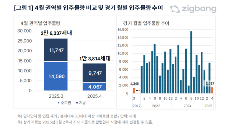 26일 직방 조사에 따르면 4월 전국 아파트 입주물량은 1만3814가구로, 전월(2만6337가구) 대비 48% 적다.