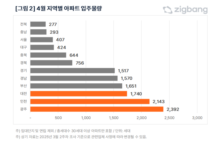 지방은 9747세대 입주해 전월(1만1747세대)보다 물량이 17% 적다. 총 18개 단지로 이루어져 있으며 각 단지별 총세대수 규모가 1000세대 미만으로 비교적 소규모 단지들로 구성돼 있다. 광주 2392세대, 대전 1740세대, 부산 1651세대, 경남 1570세대 등 광역시 위주로 입주물량이 공급될 예정이다.