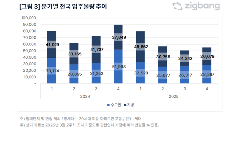 올해 1분기에는 7만 9,782세대의 새 아파트가 입주했으며, 남은 2~4분기에는 각 분기당 약 5만 세대 수준의 입주 물량이 공급될 예정이다. 예년 동기간 비교 시 적은 물량이 공급되지만 공급감소는 주로 물량 부담이 컸던 수도권 외곽과 지방광역도시를 중심으로 이루어지는 만큼 단기적인 시장 충격은 크지 않을 전망이다. 그러나 중장기적으로는 전체적인 공급 감소로 인해 신축 아파트의 희소성이 부각되면서 주택 가격 상승과 임차 시장 불안 등으로 이어질 가능성이 있다.