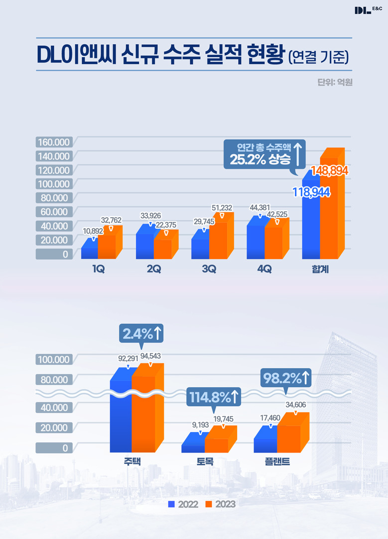 DL이앤씨는 잠정 실적발표를 통해 연결기준 2023년 연간 매출 7조 9,945억원, 영업이익 3,312억원이 예상된다고 2월 1일 공시했다. 2023년 연간 매출은 2022년 대비 6.6% 증가한 실적을 기록했다. 지난해 연결기준 신규 수주는 2022년 보다 25.2% 증가한 14조 8,894억원을 기록하며, 연간 목표인 14조 4천억원을 4천억원 이상 초과 달성했다.