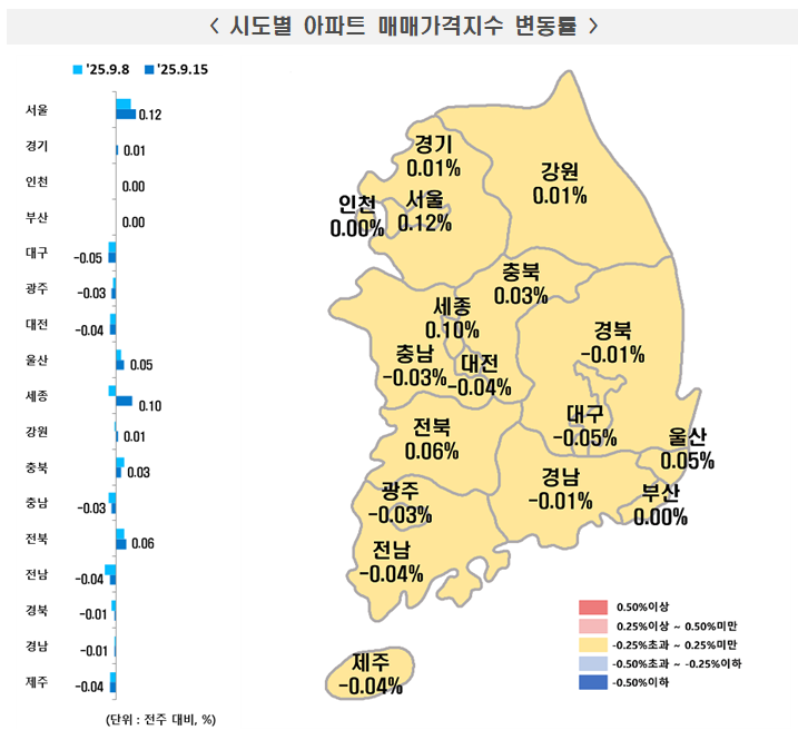 한국부동산원이 18일 발표한 9월 셋째 주(9월 15일 기준) 전국 아파트 가격 동향에 따르면, 서울 아파트 매매가격은 전주 대비 0.12% 상승해 2주 연속 상승폭 확대 흐름을 이어갔다.