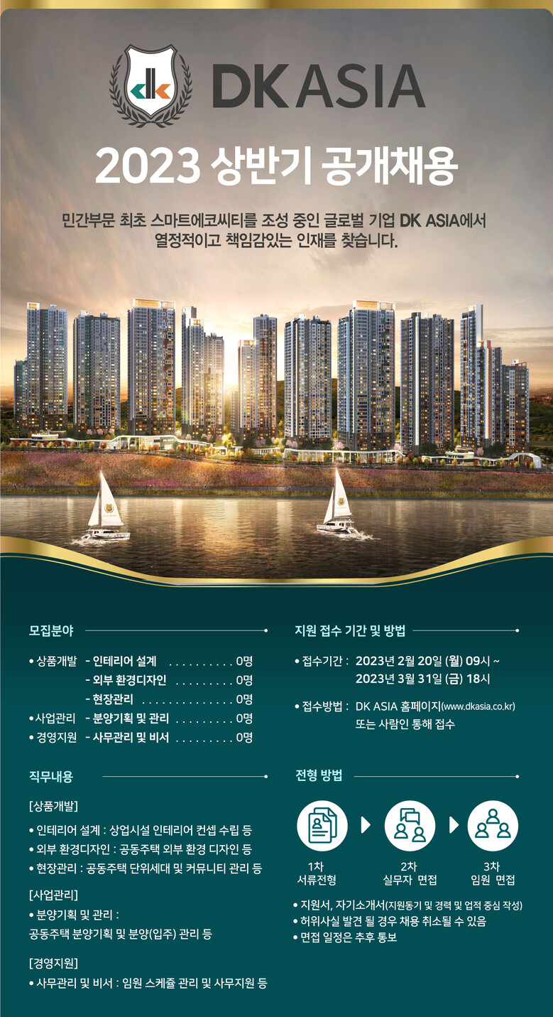 DK ASIA는 “대한민국 도시와 주거문화를 함께 이끌어갈 각 분야의 전문인력을 공개 채용한다”고 20일 밝혔다. DK ASIA의 상반기 공개채용은 오는 2월 20일부터 3월 31일까지 40일간 진행된다.