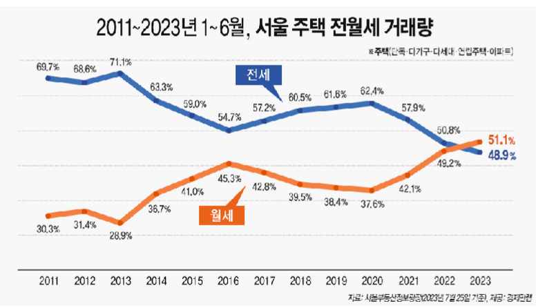 상반기 기준 서울 주택 임대차 시장에서 전세가 차지하는 비중이 50%를 넘지 못한 것은 서울부동산정보광장이 관련 통계를 집계하기 시작한 2011년 이후 처음이다.