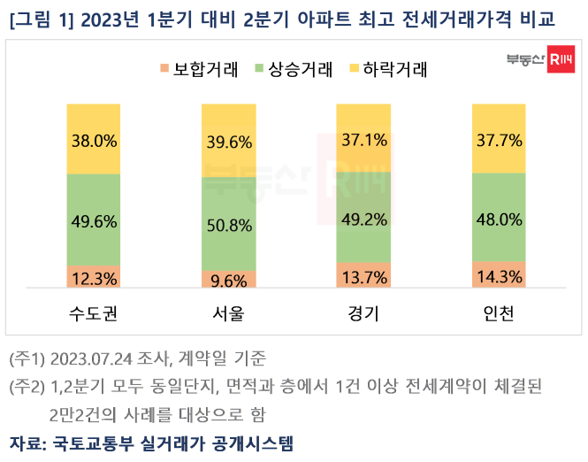 부동산R114가 국토교통부 실거래가 자료를 통해 2023년 1월부터 6월까지 체결된 수도권 아파트 전세계약 총 21만9,557건 가운데 동일단지, 동일면적과 층의 거래가 1분기와 2분기 모두 1건 이상씩 있었던 2만2건의 최고 거래가격을 비교했다. 그 결과 1분기 대비 2분기 가격이 오른 수도권 아파트 거래비중은 49.6%(2만2건 중 9,930건)로 집계됐다. 서울은 상승 거래비중이 50.8%(7,182건 중 3,647건)로 과반을 넘어섰으며 이어 경기 49.2%(1만1,039건 중 5,429건), 인천 48.0%(1,781건 중 854건) 순으로 나타났다.