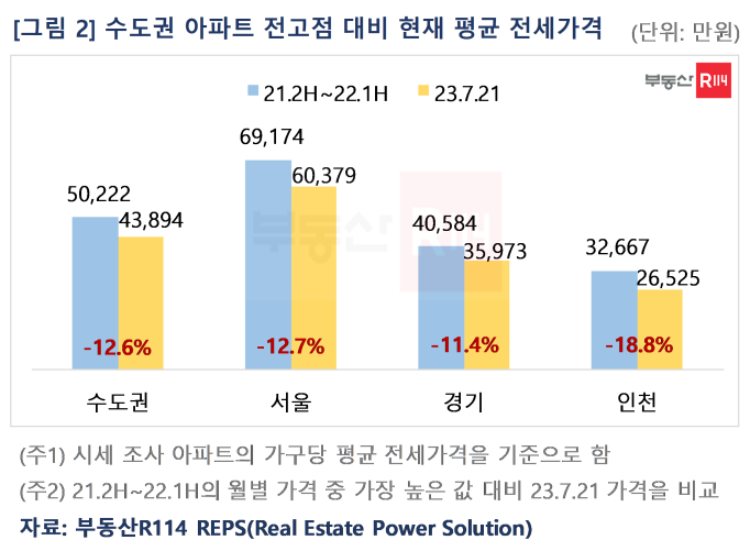 7월 가구당 평균 전세가격, 전고점(21.2H~22.1H) 대비 12.6% 낮아
