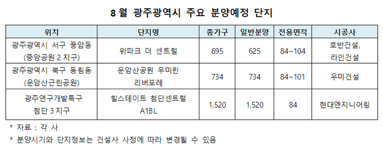 이 외에도 현대건설이 북구 신용동 지역주택사업인 '힐스테이트 신용 더리버'의 일반분양을 진행하며, 중흥건설이 남구 송하동 송암공원 민간공원특례사업으로 1,956 가구의 대단지 공급을 계획하고 있다.