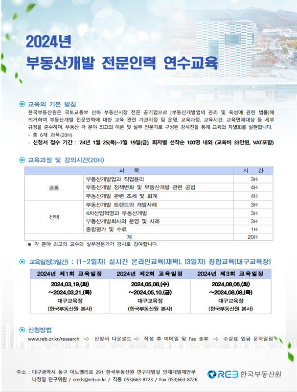 교육 대상자는 부동산 '개발 전문인력의 교육에 관한 규정'에 따른 대상자에 한하며, 교육 신청은 3월 7일까지 담당자 전자메일(creds@reb.or.kr)로 상시 접수가 가능하다.