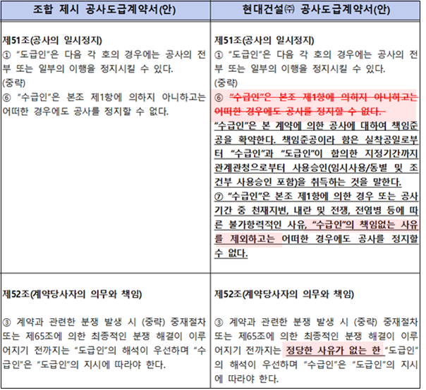 | ▲한남4구역 조합에 제안한 현대건설의 공사도급계약서(안). 책임준공을 약속했지만 계약서 곳곳에서 공사 중지 가능성을 열어 놓고 있다 / 제보자 제공 |
