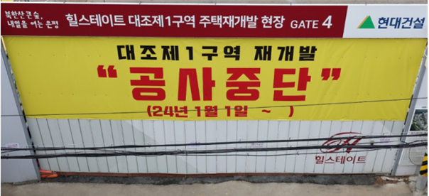 | ▲서울 은평구 대조동 대조1구역 주택재개발 현장 입구에 현대건설이 공사비 미지급 등의 사유로 공사 중단 안내문을 걸었다. 이 현장은 금년 조합총회에서 공사비 2566억원 증액안을 통과시키며 공사가 재개됐다 / 조합원 제공 |