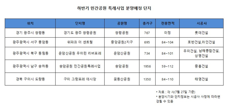 하반기 공급을 앞둔 민간공원 특례사업 단지도 많은 주목을 받고 있다. 올 하반기 전국에서 민간공원 특례사업으로 분양되는 아파트는 5개 단지 총5,502가구다. 지역별로 ▲광주광역시 3개 단지 3,385가구 ▲경북 1개 단지 1,350가구, 수도권에서는 경기도 광주시에서 유일하게 1개 단지 767가구가 공급된다.