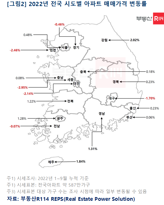 9월 현재 작년 대비 약세로 전환한 지역은 총 6곳으로 확인된다. 세종시가 2.95% 떨어지며 전국 17개 시도 중 하락폭이 가장 크게 나타났으며, 2021년 상승폭(34.52%)이 가장 가팔랐던 인천은 단기 상승 부담감이 커지며 2.46% 하락했다. 그 외 △대전(-2.14%) △대구(-1.70%) △경기(-0.46%) △전남(-0.07%) 등이 약세를 나타냈다.