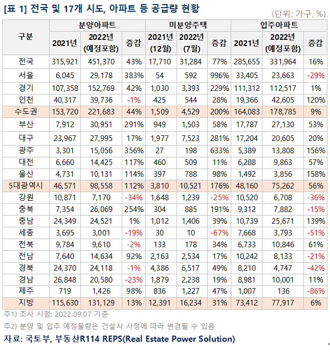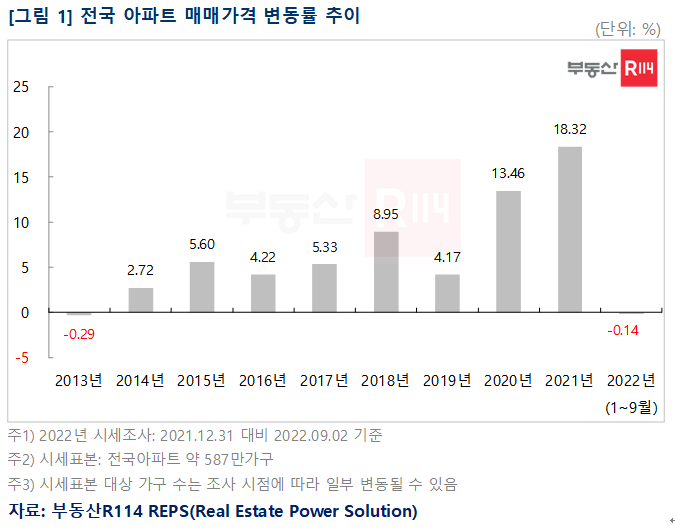부동산R114에 따르면 2022년(1~9월) 전국 아파트 매매가격은 0.14% 하락해 2013년(-0.29%) 이후 9년 만에 약세 전환이 임박한 것으로 나타났다. 한국은행의 급격한 금리인상에 따른 이자 부담 증가와 대출 규제 강화, 주요 지역의 가격 부담감 등의 영향으로 주택 거래량이 역대 최저 수준으로 줄어든 상황이다. 지금의 시장 환경에 별다른 변화가 없다면, 약세 국면은 추석 연휴 이후에도 이어질 전망이다.