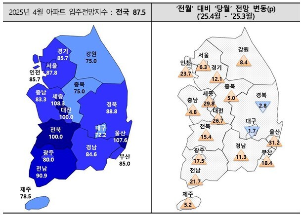 주택산업연구원이 10일 발표한 '2025년 4월 아파트 입주전망지수'에 따르면, 4월 전국 입주전망지수는 87.5로 전월(73.8)보다 13.7포인트 급등했다