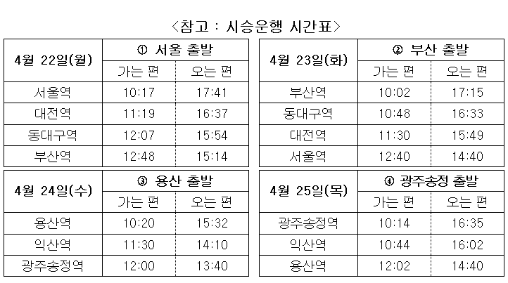 시승열차는 22일과 23일은 경부선, 24일과 25일은 호남선으로, 총 8회 운영하며, 경부선은 서울·대전·동대구·부산에서 승차하고, 호남선은 용산·익산·광주·송정에서 승차한다.