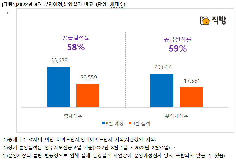 지난 7월말에 조사(7월 28일)한 8월 분양예정단지는 51개 단지, 총 3만5,638세대, 일반분양 2만9,647세대였다. 이를 재조사한 결과 실제 분양이 이루어진 단지는 36개 단지, 총 2만559세대(공급실적률58%), 일반분양 1만7,561세대(공급실적률59%)가 실제 분양됐다.