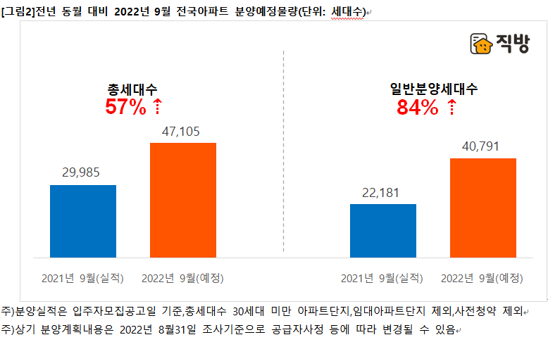 2022년 9월에는 71개 단지, 총 세대수 4만7,105세대 중 4만791세대가 일반분양을 준비하고 있다. 2021년 동월 물량과 비교해 총세대수는 1만7,120세대(57%증가), 일반분양은 1만8,610세대(84%증가)가 더 분양될 예정이다.