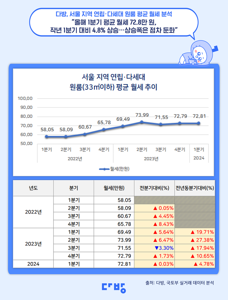 다방이 분석한 데이터에 따르면, 작년 한 해 동안 서울 지역 원룸의 평균 월세는 23년 1분기 69.5만 원, 23년 2분기 74만 원, 23년 3분기 71.6만 원, 23년 4분기 72.8만 원으로 상승세를 유지하는 모양새다.