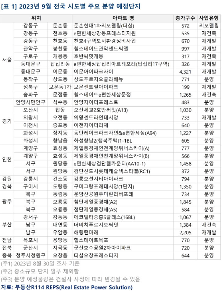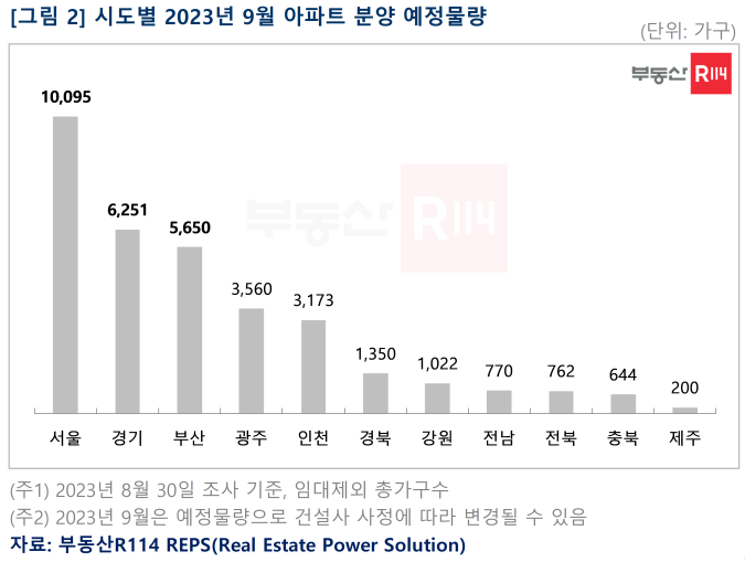 9월 예정된 지방 분양물량은 총 1만3,958가구로 작년 동기(9,467가구) 대비 47% 늘어난다. 물량 증가를 이끈 지역은 부산(5,650가구 예정)과 광주(3,560가구 예정)로 2개 지역 물량이 지방 전체 물량의 절반 이상을 차지한다. 주요 단지로는 △부산 남구 우암동 해링턴마레(2,205가구) △부산 남구 대연동 더비치푸르지오써밋(1,384가구) △광주 북구 첨단제일풍경채(A2블록 1,845가구) △경북 구미시 도량동 구미그랑포레데시앙(1,350가구) 등을 주목할 만하다.