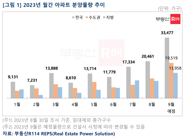 부동산R114(www.r114.com) 조사에 따르면 9월 전국에서 3만3,477가구(임대제외 총가구수)의 분양물량이 예고됐다. 올해 월간 기준으로 가장 많은 물량이며, 작년 동기의 1만4,793가구와 비교해도 2배 이상 많다. 가을 성수기의 시작점에 성수기다운 물량이 쏟아진다고 평가할 수 있다. 최근 수도권 분양단지의 청약경쟁률이 치열해지면서 지방에서의 분양성적과 미분양 우려감도 점차 개선되고 있다. 예정된 9월 물량이 상당한 만큼 수도권은 물론 지방 분위기 개선의 분기점이 될 수 있을지 귀추가 주목된다.