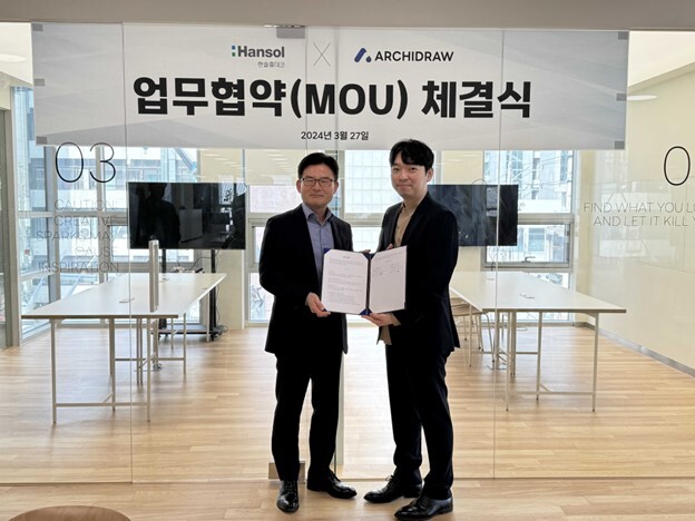 AI 프롭테크 기업 아키드로우와 한솔홈데코는 지난달 27일 업무협약을 체결하고 3D 인테리어 솔루션 아키스케치와 한솔홈데코의 건축자재 전문성을 결합해 고객에게 차별적인 만족을 제공할 수 있는 제품과 서비스를 혁신하는데 협력하기로 했다고 밝혔다.