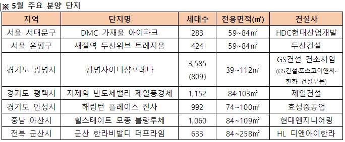 이처럼 시장 전체의 분양물량은 줄었지만, 대단지 알짜 분양단지들이 공급을 앞두고 있어 실수요자들에게는 좋은 기회가 될 수 있을 것으로 보인다. 5월에는 충남 아산과 경기도 광명ㆍ평택 등 수도권 서남부 지역을 중심으로 신규분양이 이뤄 질 것으로 보인다. 특히, 이들 지역은 대규모 개발 호재들이 이어지는 지역으로 주거환경이 쾌적 하고, 대단지‧브랜드 아파트가 예정되어 있어 수요자 입장에서는 선택의 폭이 넓어진다는 면에서 긍정적으로 평가 받고 있다.