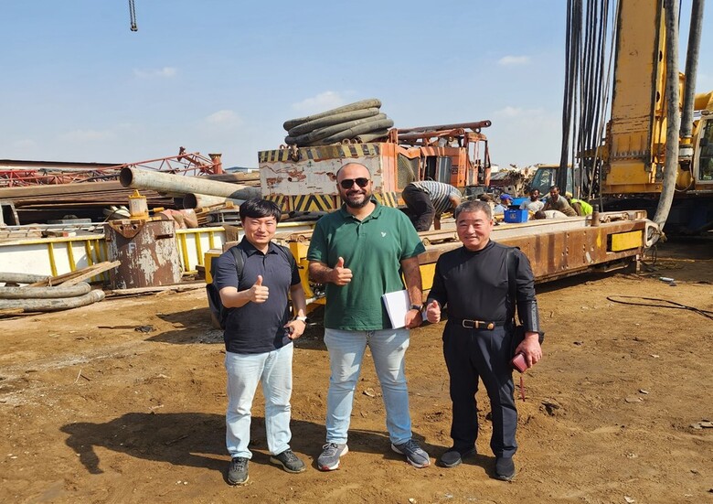 | ▲강태영 ㈜원강 대표(좌) 유진이렉션 이영종 사장(우)과 사우디아라비아 제다 현지건설업체와 기념 촬영을 하고있다. <사진제공=㈜원강> |